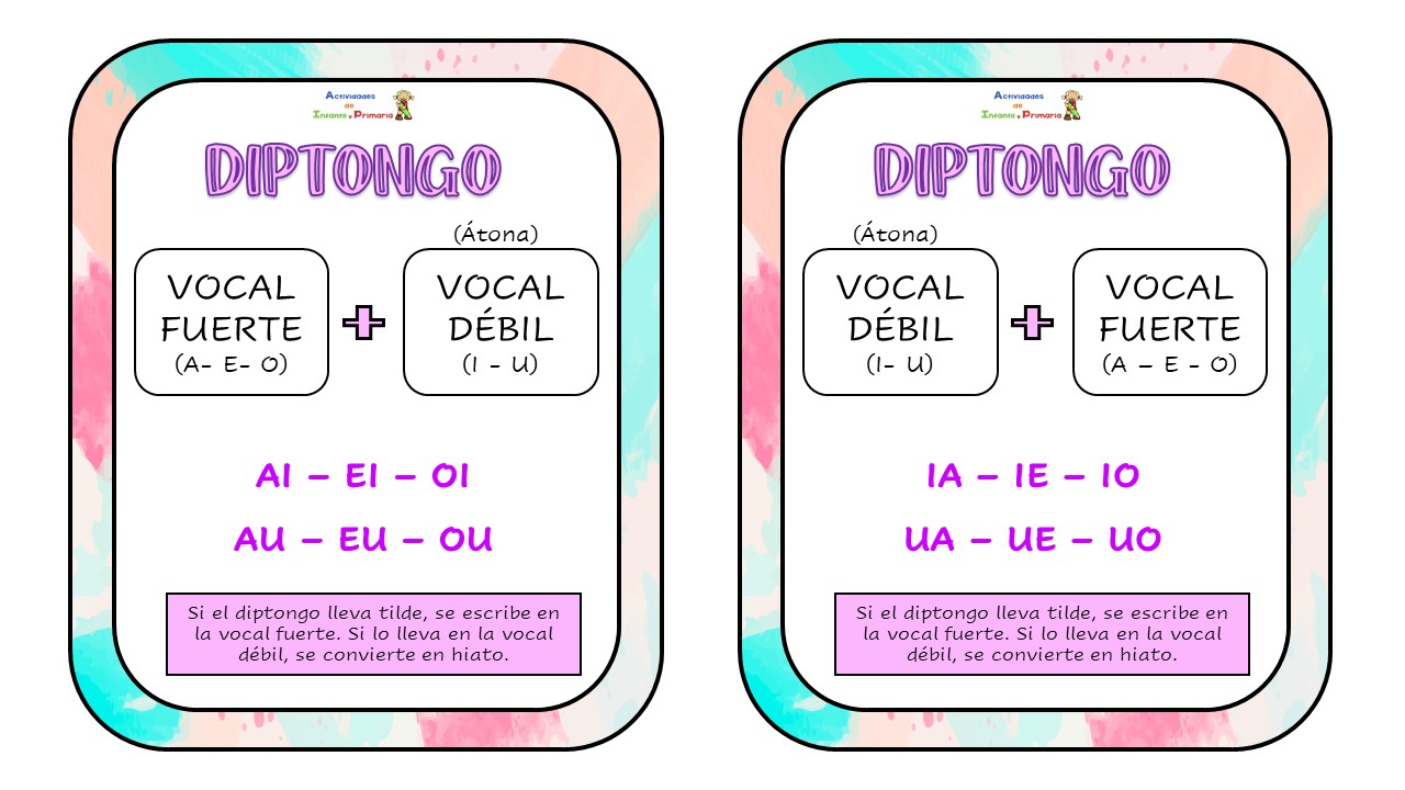 Se llama diptongo a la unión de dos vocales distintas que se pronuncian en la misma sílaba. Pueden formar diptongos las siguientes combinaciones: